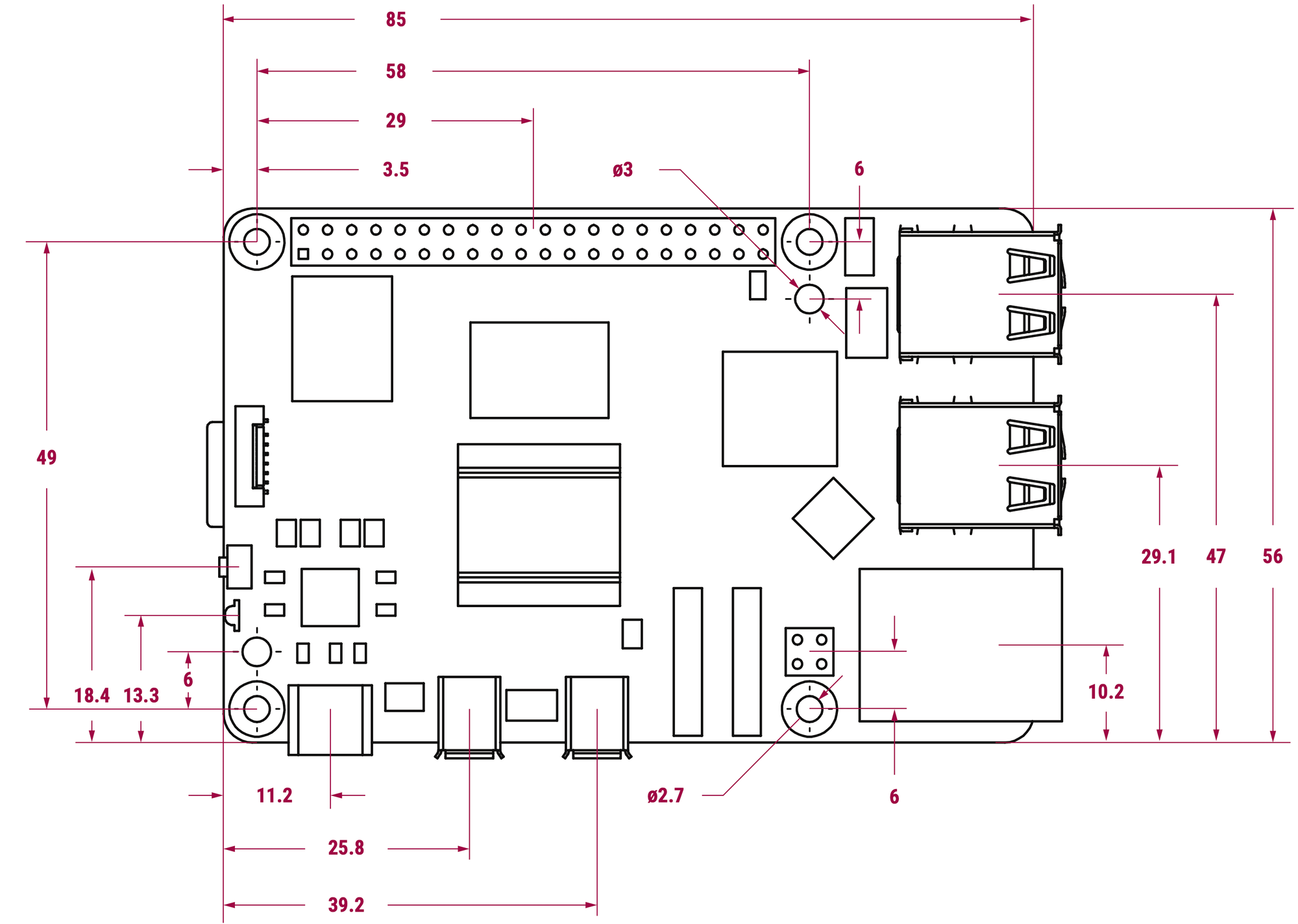 Creating a 3D model is an iterative process that usually requires several attempts until everything fits as desired. Precise measurements are a great help here. Let’s take a look at the data sheet (Figure 1) of the Raspberry Pi 5. We can take some measurements for our case from this, such as the space between the mounting holes. But not all of the required dimensions can be found here; you will need a caliper gauge to determine the others.