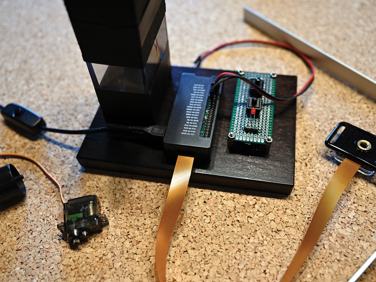 Now it’s time to saw and drill holes. After that, I added the servo and the mechanical system. The whole thing was then mounted on a base plate, which also bears the Zero W and a small circuit board with a status LED and control buttons (Figure 3).