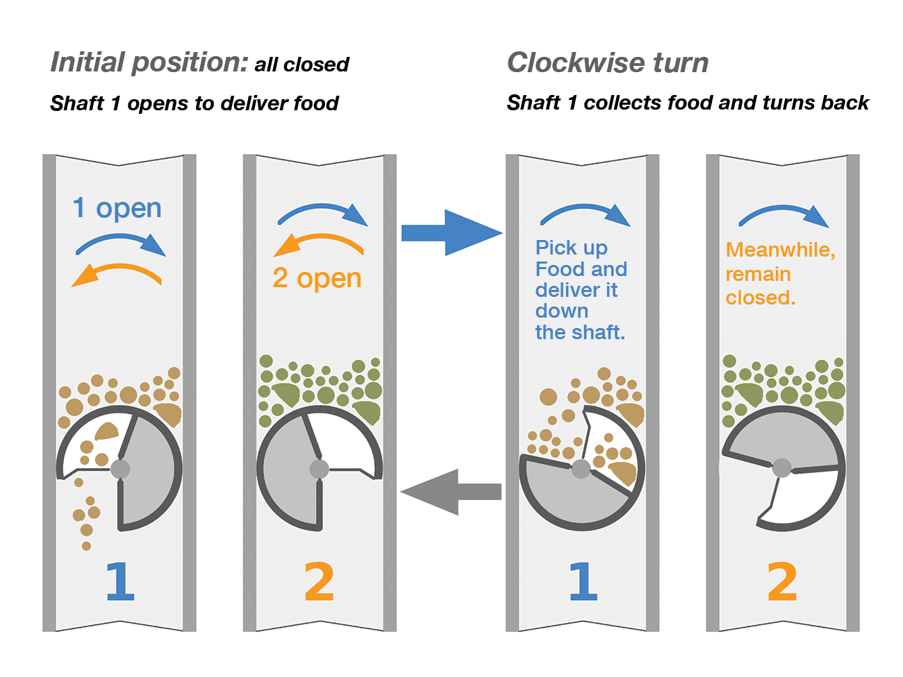 Because of the angular offset, only one of the two shafts can open at any given time during a short left or right turn, and it is closed again automatically a short time later. Small paddles act as the closures to avoid a shaft remaining permanently open and ensure that the desired amount of feed is delivered (Figure 4).