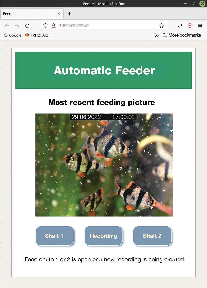 To access the web interface on the local network, simply enter the local IP address of the Zero W in a web browser. To monitor the system remotely while on vacation, you need to enable the server on the Zero W in your router for the web and assign a permanent IP. However, if you already use a website with FTP access, you can alternatively upload the current feeding image to your own web space and view it there.