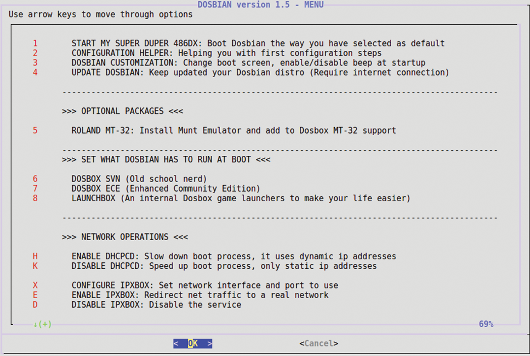 Although many very old DOS games and numerous applications under DOS do not support mouse control, you should have a mouse connected to the system to adjust some settings. If you want to use Dosbian with an older Raspberry Pi that does not yet have hardware for wireless network access, you will need to connect the SBC to the Internet with the Ethernet socket; then, boot the system and enter the exit command at the DOS prompt. Dosbian now opens a special configuration menu (Figure 1).