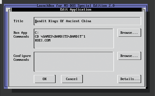 In the Title box, enter the title you want to appear as a starter in the menu. In the Run App Commands box, type the DOS command you normally use to start the new game or application at the prompt. If you don’t know the exact path, click the Browse button on the right to open another window with a small file manager, in which you click your way through the directory structure to the target folder and select the appropriate executable or batch file. The Configure Commands box also lets you specify additional parameters (e.g., if you need to call additional files in the context of the program file). You can enter these randomly or select them by clicking Browse to the right of the input field.