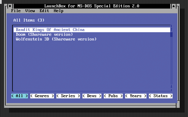 If you have added a large number of games to the main menu, you can filter the list from the bottom option line with keywords – assuming you entered some metadata to use for the search. The Tab key or arrow keys let you jump backward and forward between the individual categories in the lower option bar. The Genre selection, for example, puts in the upper part of the LaunchBox list the game genres you have entered. After selecting one of the genres and pressing Enter, the software branches to a new list that displays all the program entries that match the respective criterion. You can then select one of the matches and press Enter again to launch the selected game.
